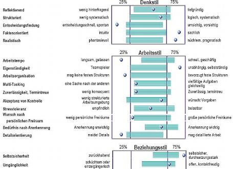 Beziehungsstil: Gemessen werden der interpersonelle Stil, die Kritikfähigkeit und emotionale Ausgeglichenheit. Die hier dargestellten Persönlichkeitseigenschaften geben Auskunft über die Art und Weise, wie eine Person ihre sozialen Kontakte gestaltet, wie sie anderen begegnet, wie sie auf andere wirkt, welche Grundeinstellung sie